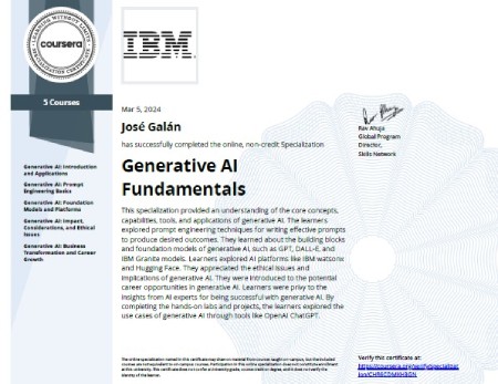Actualmente estoy realizando las formaciones online impartidas por IBM, Generative AI Engineering Professional Certificate y AI Product Manager Professional Certificate.